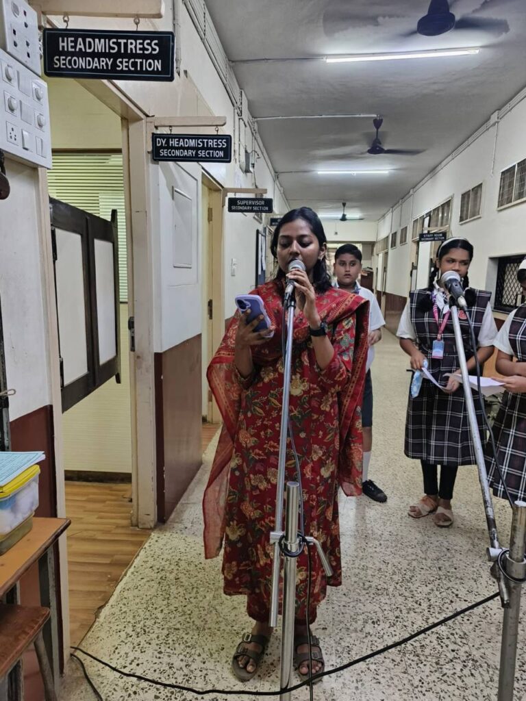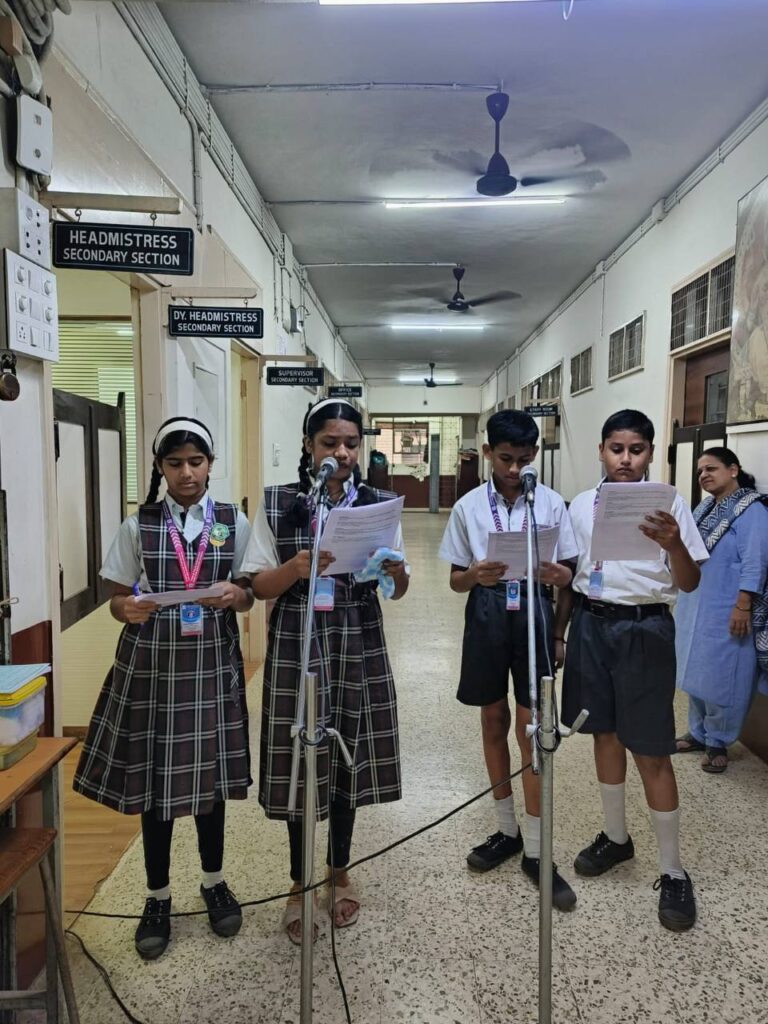 To strengthen this understanding, a radio skit written by our teacher Mrs Vinitha Nair was presented by the students of Std. VII. Directed by Miss Khushi Kapadia, the skit highlighted the making of the Constitution, the role of the Constituent Assembly, Dr B. R. Ambedkar’s contribution and the importance of the Preamble. Through a thoughtful conversation between three students, the skit explained complex ideas in a simple and relatable manner. It clarified the difference between Constitution Day and Republic Day, touched upon the length and structure of the Constitution and emphasised the ideals expressed in the Preamble along with the balance between Fundamental Rights and Fundamental Duties.