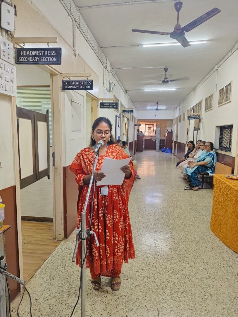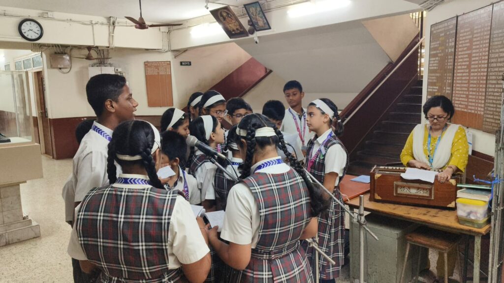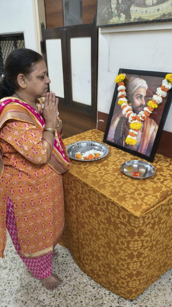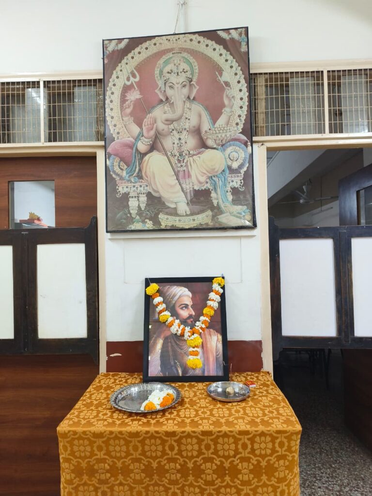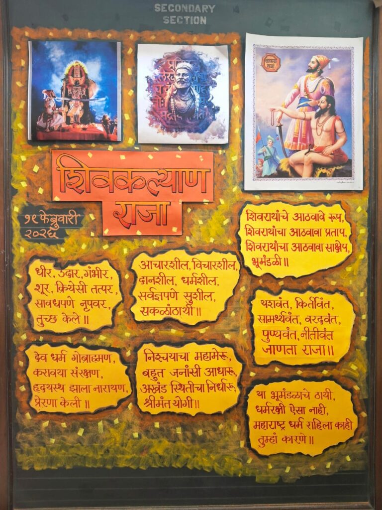 The programme commenced with the garlanding of the portrait of Shivaji Maharaj by the respected Headmistress, Mrs. Smita Biwalkar, followed by floral tributes and prayers. The display board, beautifully decorated by Ms. Beena Godambe, enhanced the festive and patriotic atmosphere of the celebration.