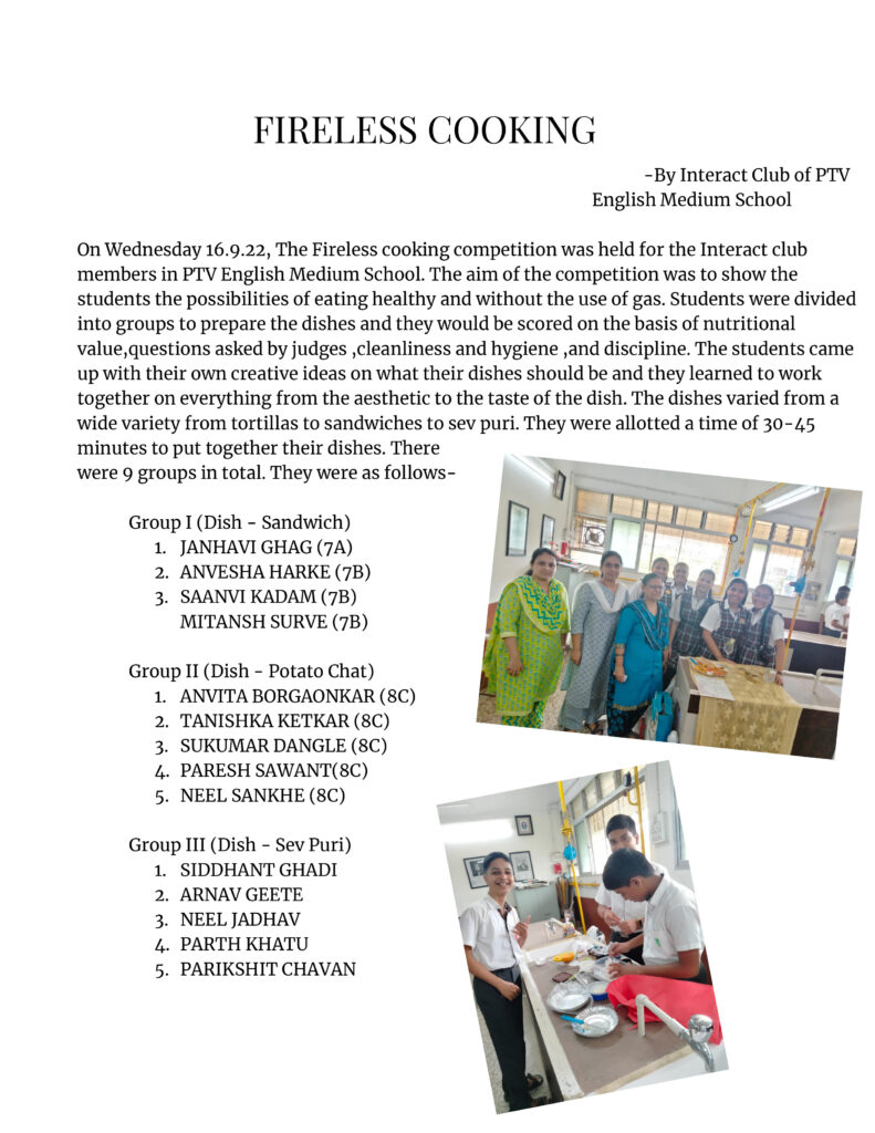 On Wednesday 16.9.22, The Fireless cooking competition was held for the Interact club members in PTV English Medium School. The aim of the competition was to show the students the possibilities of eating healthy and without the use of gas. Students were divided into groups to prepare the dishes and they would be scored on the basis of nutritional value,questions asked by judges ,cleanliness and hygiene ,and discipline. The students came up with their own creative ideas on what their dishes should be and they learned to work together on everything from the aesthetic to the taste of the dish. The dishes varied from a wide variety from tortillas to sandwiches to sev puri. They were allotted a time of 30-45 minutes to put together their dishes. There were 9 groups in total. They were as follows-