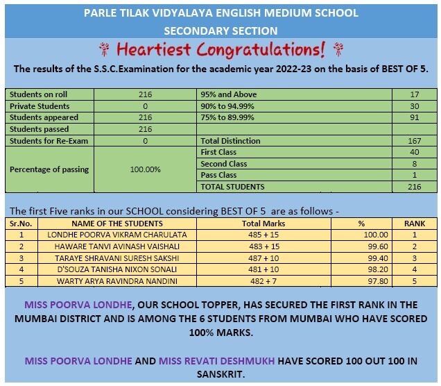 We extend our heartfelt gratitude to our esteemed parent body, Parle Tilak Vidyalaya Association, for their support and cooperation. We thank them for providing us with the best resources and guidance. This wouldn’t be possible without their invaluable contribution at every stage. We also thank all the parents for their cooperation. We congratulate our teaching and non-teaching staff for their tireless efforts in ensuring that quality education is imparted to our students.