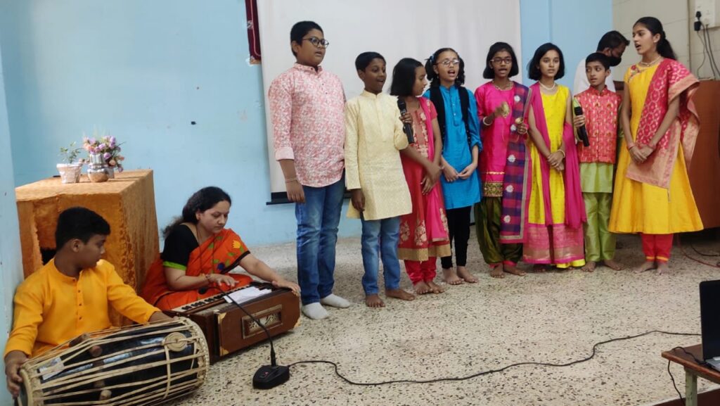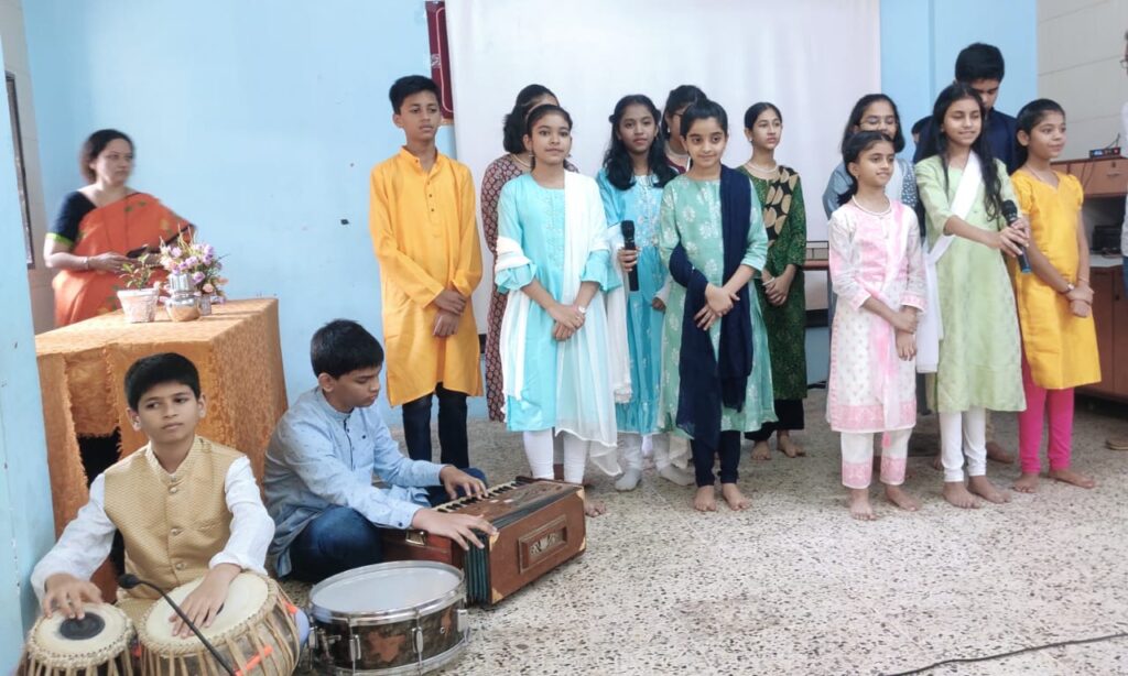 प्रमुख पाहुण्यांनी आपल्या मनोगतातून मराठी भाषेचे महत्त्व स्पष्ट केले आणि’ मराठी भाषा आपली मातृभाषा आहे हे आपले भाग्यच आहे’ असे सांगणारे  ‘लाभले आम्हांस भाग्य ‘हे कवी सुरेश भट यांनी रचलेले गीत  त्यांनी विद्यार्थ्यांसह गायले.