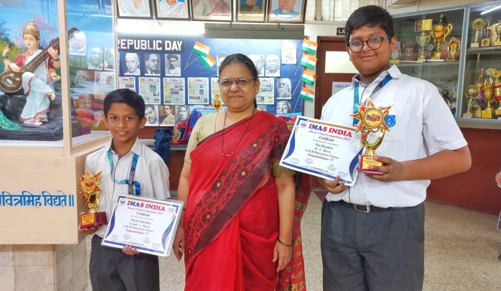 The students of Parle Tilak Vidyalaya English Medium School Om Bendre Class: VII A and Parth Adarkar from Class VI A received the Merit award at IMAS INDIA ABACUS Visual Competition 2023. The theme of the competition was ‘Speed Up the Beads.’