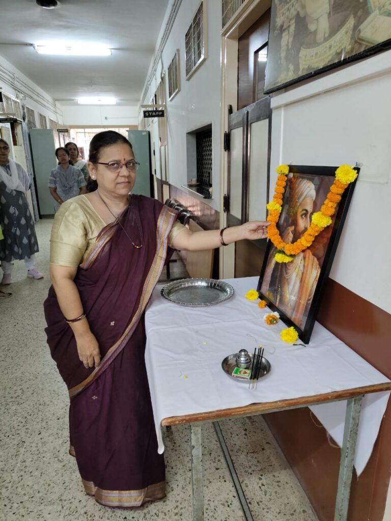 Our Headmistress Mrs. Smita Biwalkar garlanded the photo frame of Shivaji Maharaj.