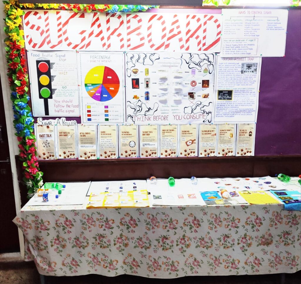 The colourful board featured a Food Traffic Signal, a pie chart on diabetes in India, and a ‘Think Before You Consume’ section showing the actual sugar content in drinks and snacks. Tips on reducing sugar and choosing healthy alternatives like fruits, dates and jaggery were also highlighted.